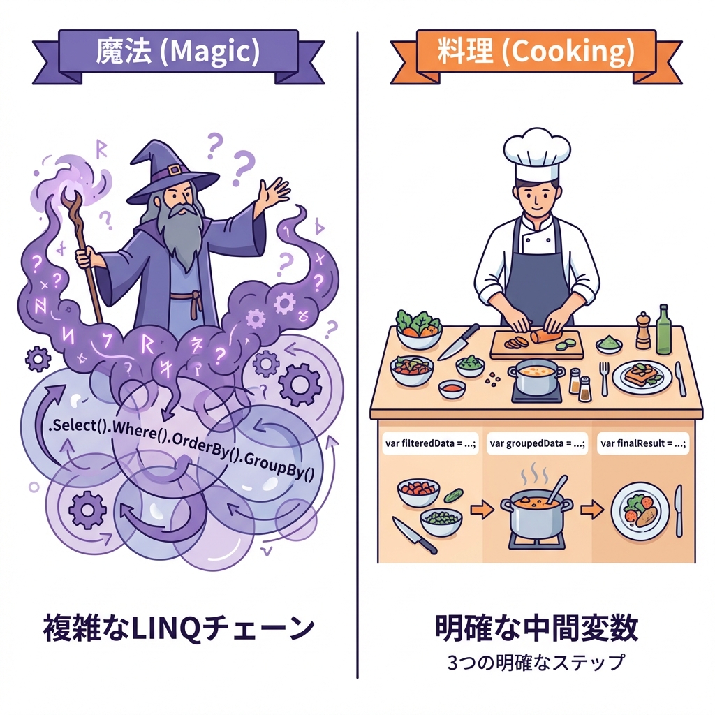 LINQは気持ちいい!でも、**長いチェーンは“謎の呪文”**になりがち😂